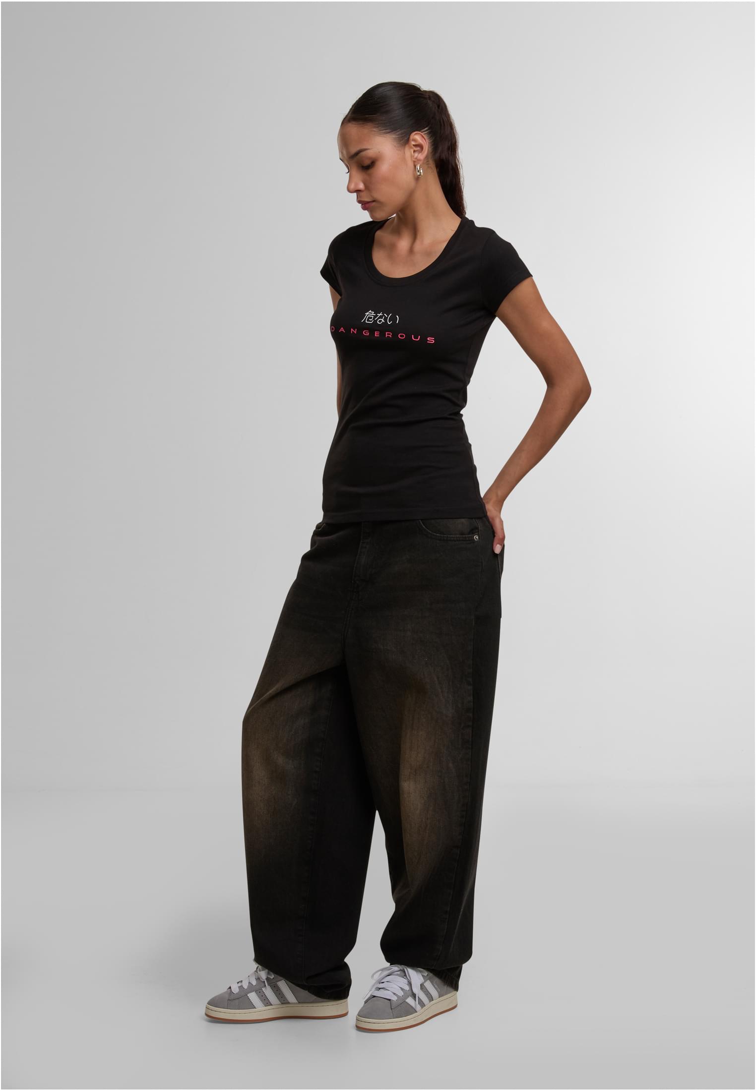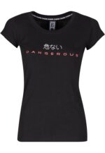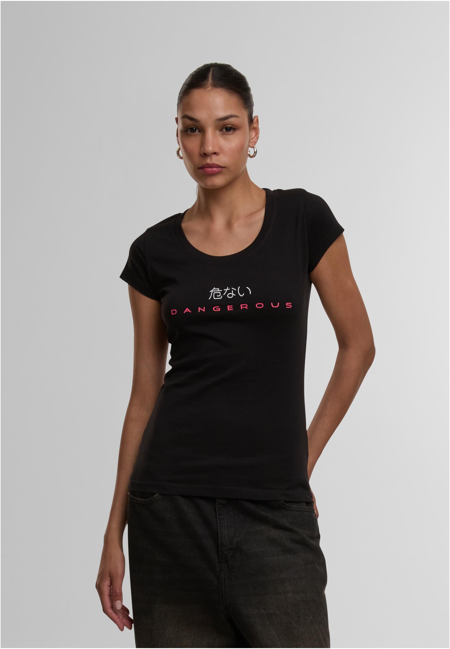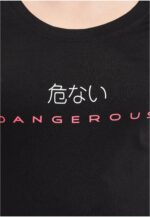 Dieses T-Shirt von Dangerous DNGRS kombiniert ein schlichtes Front-Design mit einer ausdrucksstarken Rückansicht. Auf der Vorderseite setzen ein pinkfarbener Markenschriftzug und weiße japanische Zeichen dezente Akzente. Die Rückseite hingegen beeindruckt durch einen massiven, vertikalen “DNGRS”-Print in strahlendem Weiß, der fast die gesamte Länge einnimmt. Mit seinem klassischen Rundhalsausschnitt und der körpernahen Passform ist es ein vielseitiges Basic mit dem gewissen Etwas.
