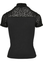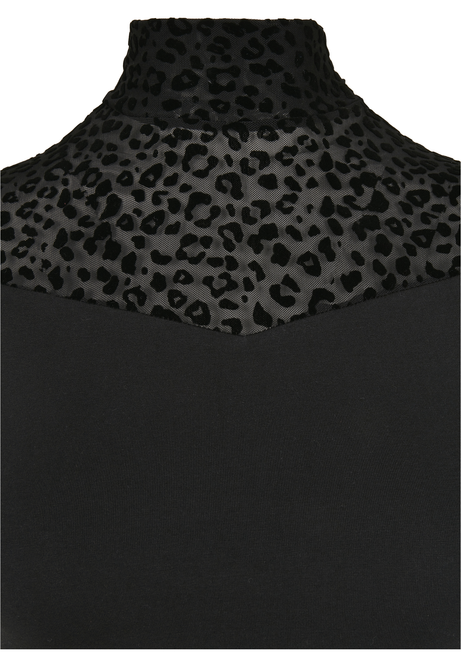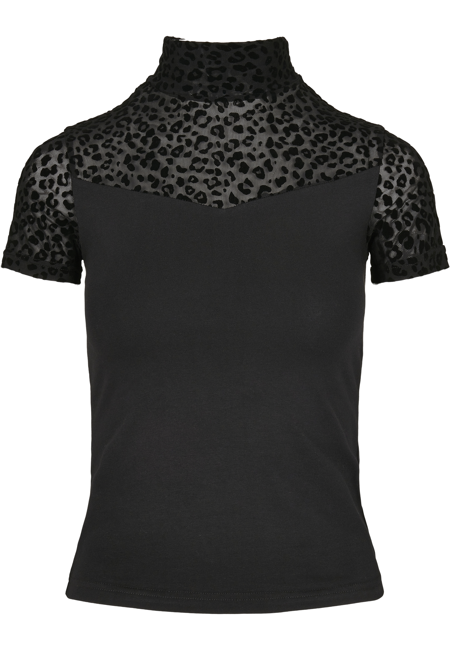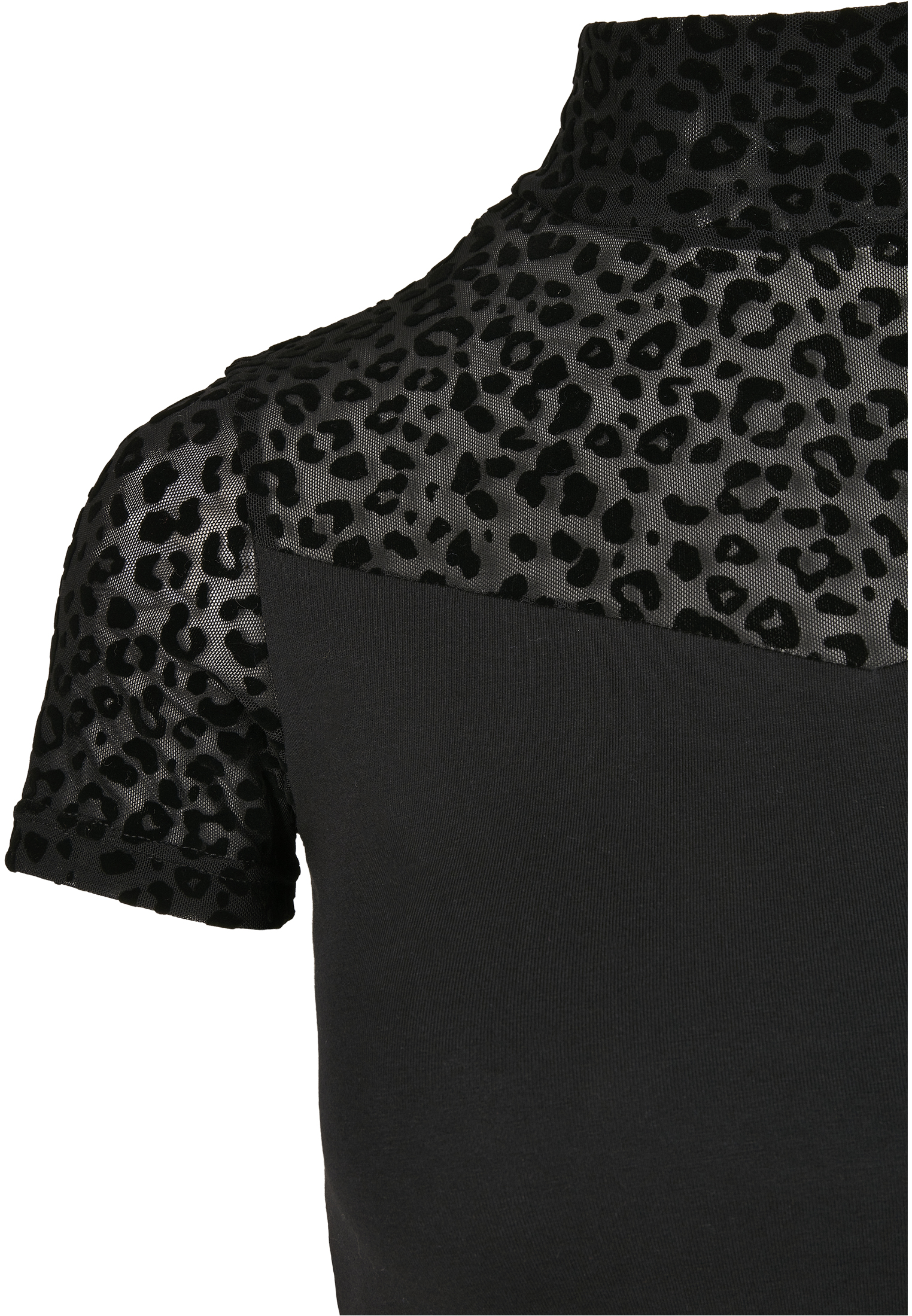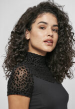 Ein aufregendes wie ungewöhnliches Damen Tee, das zwei Materialvarianten geschickt kombiniert. Ein elastischer und bequemer Jersey wird im Schulterbereich von einem heißen, transparenten Mesh abgelöst, das zudem mit einen Allover-Leo-Flockprint punktet. Dazu kommt eine tolle Passform: Das Frauen T-Shirt sitzt schön nah am Körper und wird mit einem doppellagigen Rollkragen abgerundet.